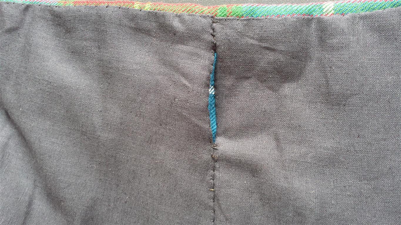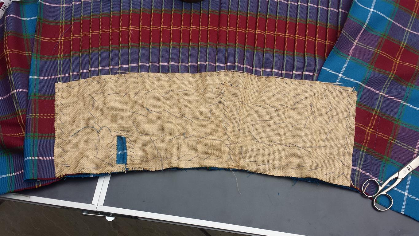 Hand-stitch down all the pleats from the waist to the hip. I use button thread for this. Keep all the stitches very small and right on the edge of the pleats, picking up only the layer of material immediately below it. The canvas to be applied later will be taking all the strain so these outer stitches only need to be strong enough to hold the pattern together. Take great care to match the pattern exactly. This is the longest part of the process but one which you can not afford to rush. Accuracy here is very important if your kilt is going to come out looking really good.