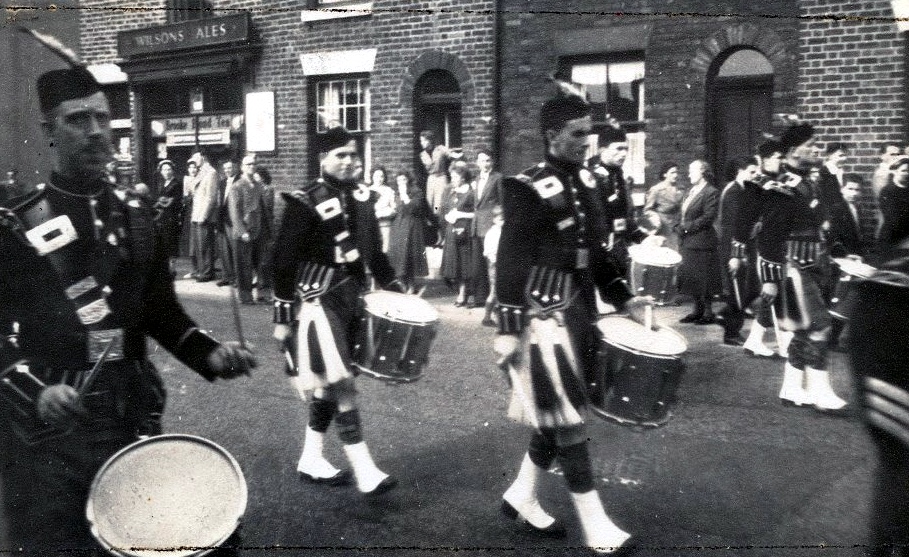 St Sebastian's Pipe Band, Broad Street, Salford, 1962. The band is led by Sammy Locke. Also included are Patrick McKenna, Wally Pegg, Terry Graham and John Vause.